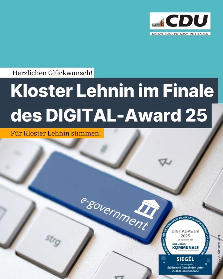 Kloster Lehnin im Finale des DIGITAL-Award 2025Die Gemeinde Kloster Lehnin hat es mit ihrem Projekt zur medienbruchfreien Antragsbearbeitung ins Finale des bundesweiten DIGITAL-Awards 2025 geschafft. Der Preis würdigt digitale Kompetenz in Kommunen, Landkreisen und Behörden. Über die endgültige Platzierung in der Kategorie "Städte und Gemeinden bis 20.000 Einwohnende" entscheidet ein öffentliches Online-Voting, das bis zum 22. Oktober 2025 möglich ist.Hier abstimmen für Kloster Lehninhttps://kommdigitale.de/digital-award-2025-votingDas witzige Video gibt es hier 👇👇👇https://youtu.be/Gjr_eb0i1Bc#abstimmen#gewinner #egovernment #CDUPotsdamMittelmark