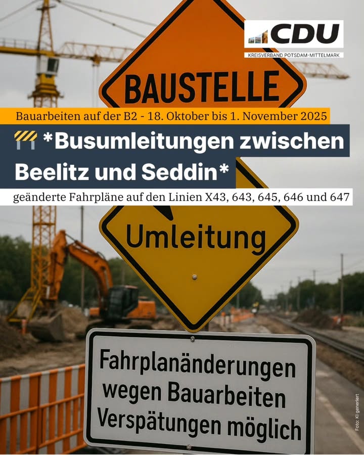 Da schon einige gefragt hatte was mit den Buslinien passiert. Hier die Informationen dazu.🚧 *Busumleitungen zwischen Beelitz und Seddin*Wegen Bauarbeiten auf der B2 gelten vom *18. Oktober bis 1. November 2025* geänderte Fahrpläne auf den Linien X43, 643, 645, 646 und 647.Es kommt zu Umleitungen, veränderten Fahrzeiten sowie entfallenden Haltestellen und Fahrten.📅 Bitte planen Sie mehr Zeit für Ihre Fahrten ein. ℹ️ Alle Infos zu den Baufahrplänen und Ersatzverbindungen finden Sie auf der Website von regiobus: 👉 https://www.regiobus-pm.de/news/artikel/bus-x43-643-645-646-647-umleitung-zwischen-beelitz-und-seddin/