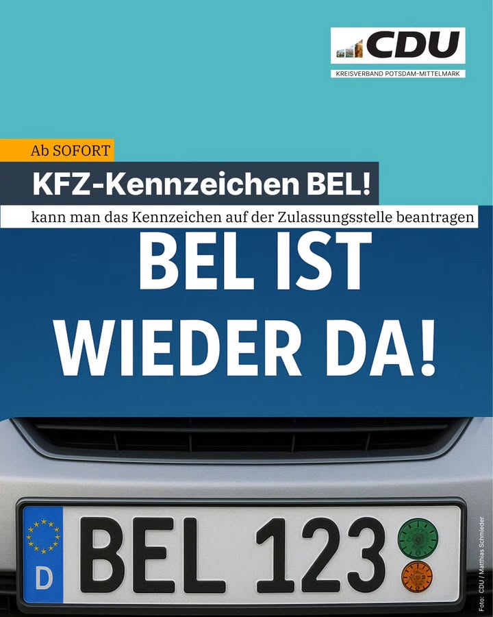 BEL ist wieder da ? ein Stück Heimat kehrt zurück!Was viele sich lange gewünscht haben, ist jetzt Wirklichkeit: In Potsdam-Mittelmark gibt?s endlich wieder Kennzeichen mit der altvertrauten Buchstabenkombi BEL.Für viele steht BEL bis heute für Wurzeln, Identität und Verbundenheit mit unserer Region. Und genau diese Werte tragen wir als CDU Potsdam-Mittelmark weiter ? nah an den Menschen, mit Herz für die Heimat.
